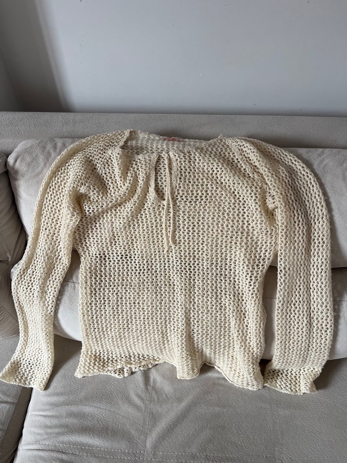 Bohem tarzı, uzun kollu, yuvarlak yaka, rahat kesim beyaz örgü kadın kazak. Günlük kullanıma uygun, rahat ve şık.