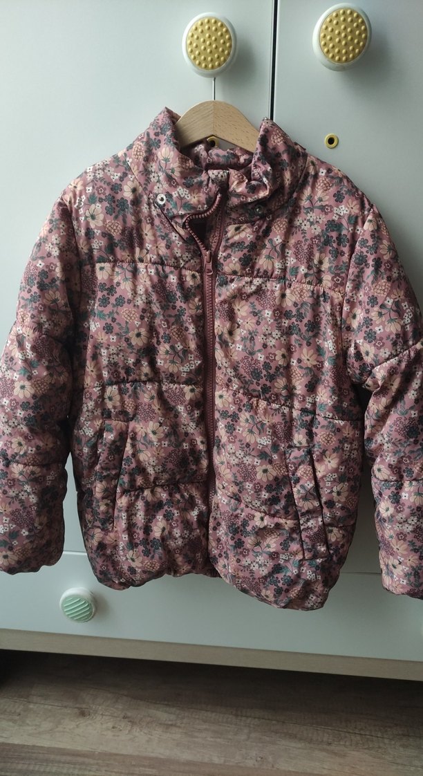 Bu kız montu, bol kesim ve yüksek yakaya sahip olup düğmeli ön kapamalıdır. Yumuşak kumaştan yapılmış, pastel kahverengi çiçek desenli bohem ve retro tarzını yansıtır.