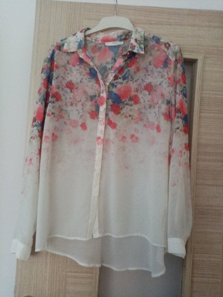 Bol kesim, uzun kollu, yakalı ve düğmeli kadın gömleği. Yumuşak sentetik kumaştan, pastel çiçek desenli ve beyaz tabanlı, günlük rahat kullanım için ideal.