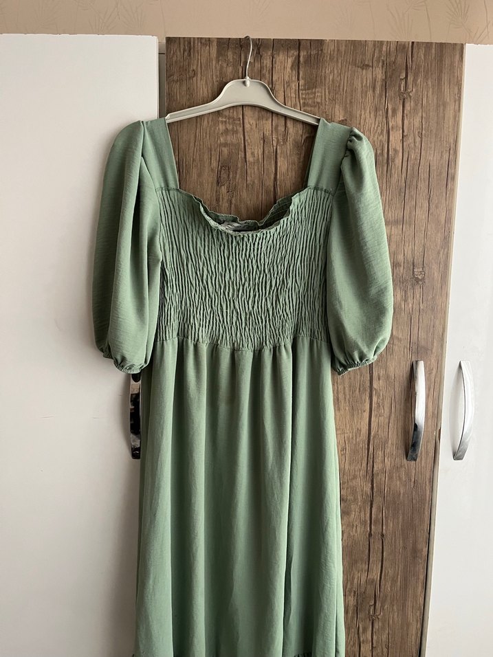Pastel haki renkte, pileli göğüs ve askılı kollara sahip bol kesim uzun keten elbise. Bohem tarzda tekne yaka detaylıdır.