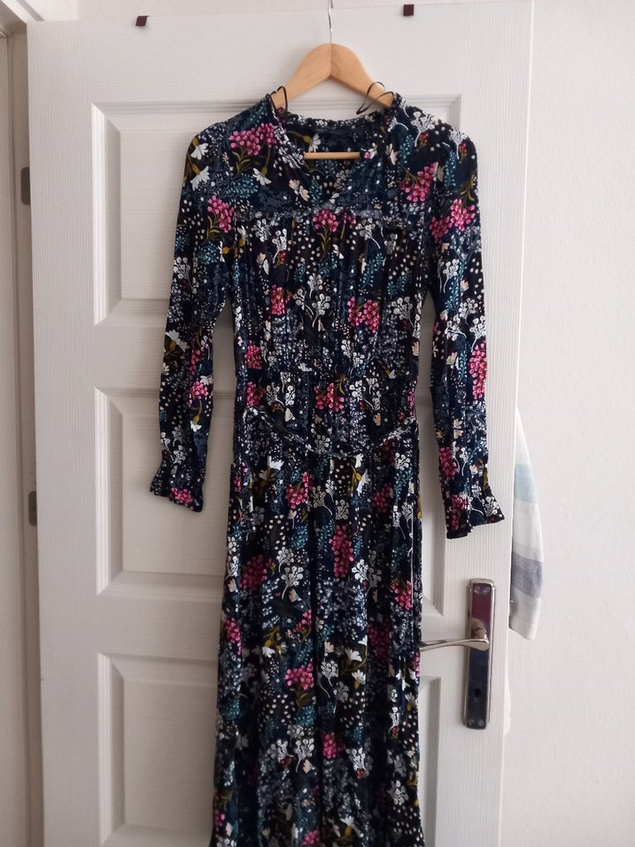 Bohem tarzda, V yakalı, pileli, çok renkli desenli uzun kollu, fit kesim elbise. Günlük kullanım için uygundur.