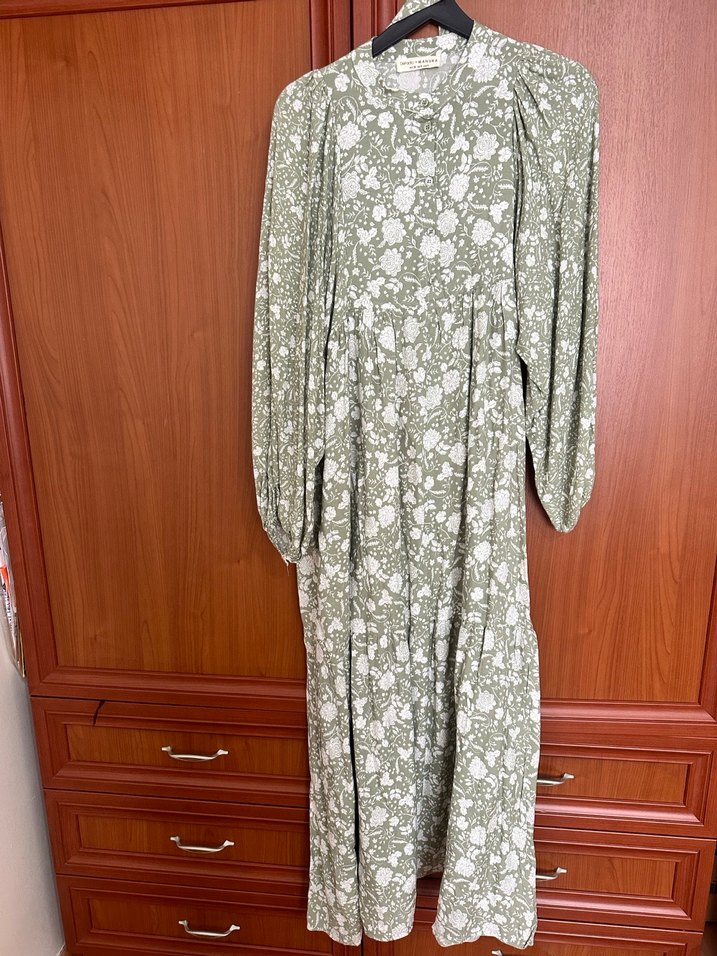 Uzun, bol kesim elbise yüksek yakalı ve uzun kolludur. Dökmeli tasarıma sahip, haki ve gri desenlidir, günlük kullanım için uygundur.