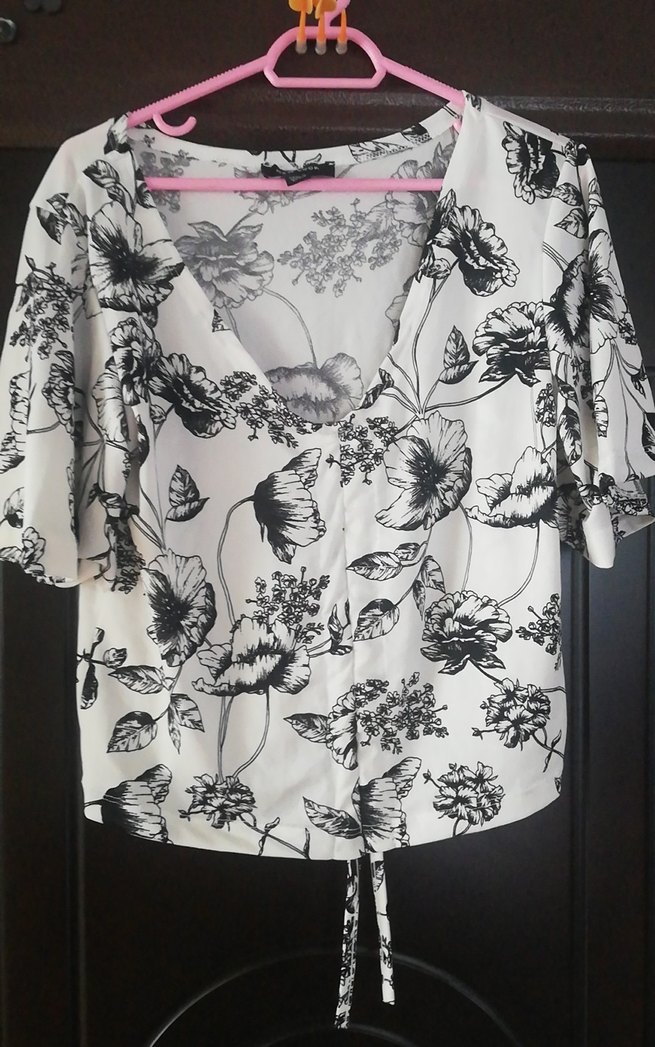 Bu bluz, kısa kollu ve V yakalı bol kesimdir. Siyah beyaz çiçek desenli, düğmeli ve midi uzunluktadır, yumuşak sentetik kumaştan yapılmıştır.