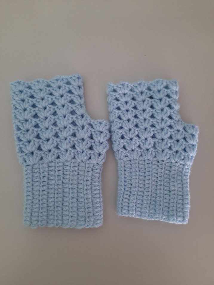 Pastel mavi renkte, bohem tarzda örgü kadın eldivenleri. Parmaksız yapısı ile rahat ve sıcak tutar, el emeği hissi verir.