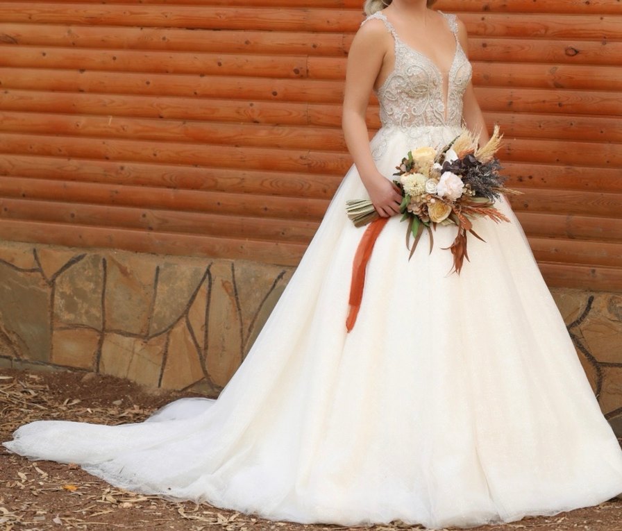 Sstraplez yakalı ve ince askılı, uzun boy A kesim gelinlik klasik ve bohem tarzı bir araya getirir.