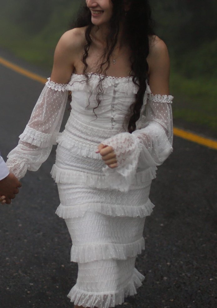 Beyaz bohem tarzda, straplez yaka ve askılı uzun kollu, kat kat fırfırlı, vücuda oturan mini gelinlik.