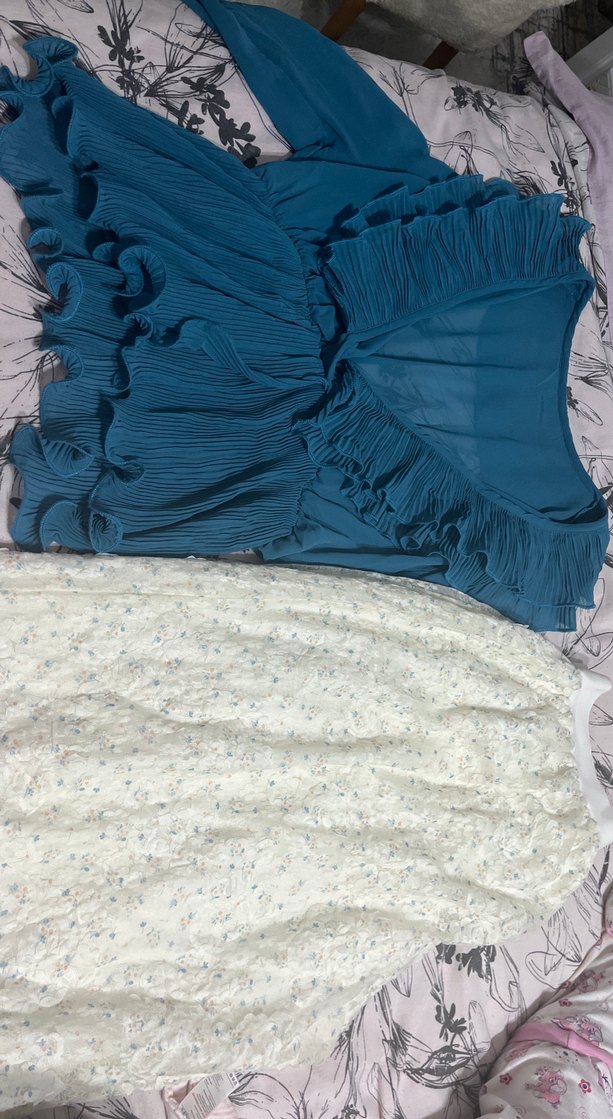 Bohem tarzı, uzun kesim ve nakış detaylı, fırfırlı mavi hamile eteği. Sentetik kumaştan, şık davetler için uygun.