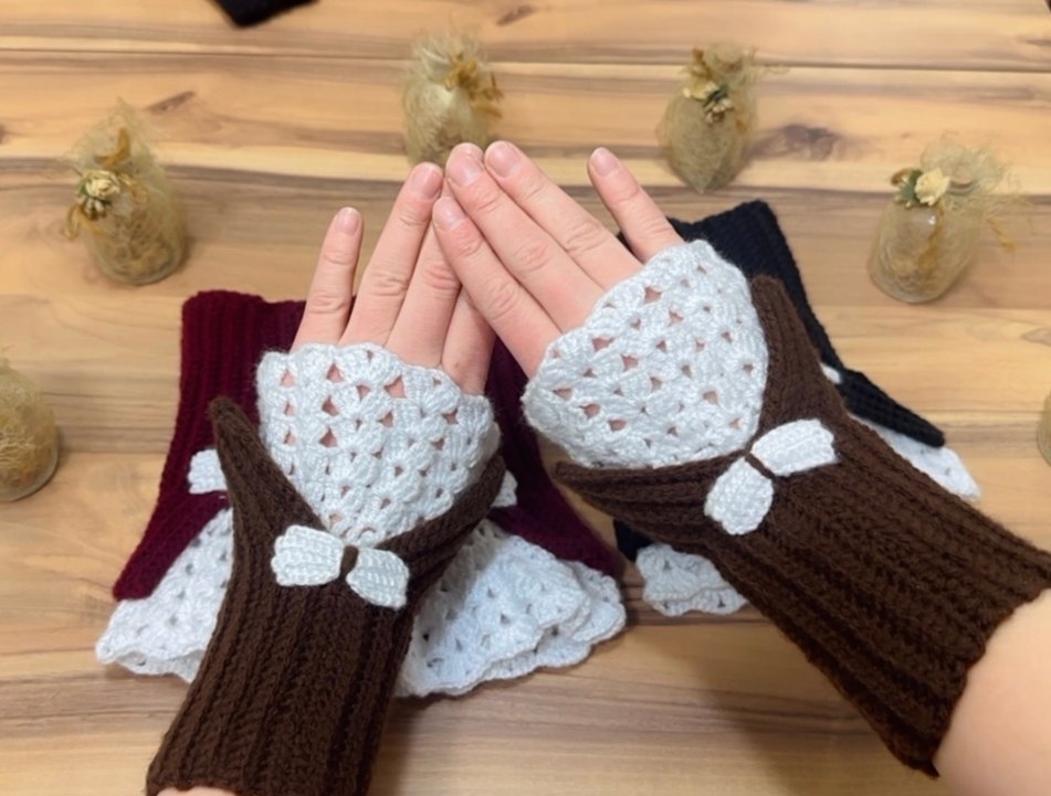 Bohem tarz açık parmaklı, beyaz tığ işi detaylı kahverengi örgü kadın eldiveni. Rahat ve hafif renkli.