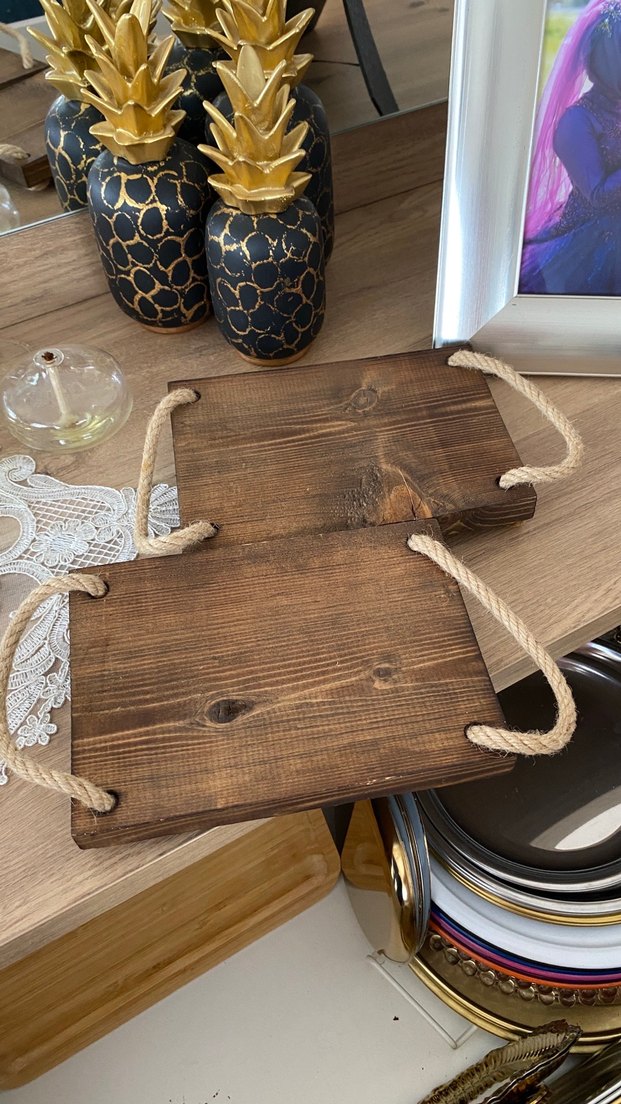 Bohem tarzda, ip saplı doğal ahşap tepsiler. Doğal ahşap dokusu ve rustik görünüm sunar. Servis veya dekor için uygundur.