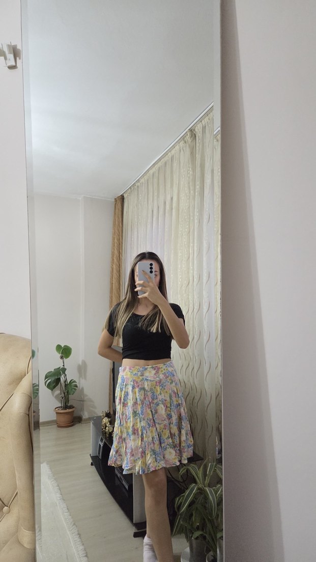 Bohem tarzda, bağlama desenli, bol kesim midi etek. Yumuşak sentetik kumaştan üretilmiştir.