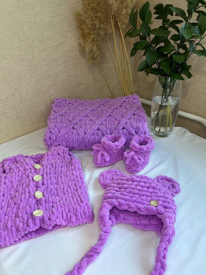 Pastel mor renkli, bohem tarzda yumuşak örgüden yapılmış bebek şapkası, düğmeli yelek, patik ve battaniye seti. istenilen renkte yapılır