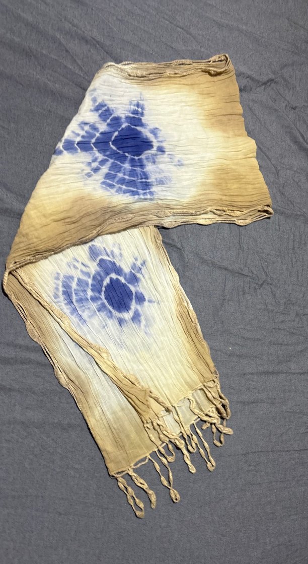 Bej keten kumaştan, koyu mavi batik desenli, püsküllü ve bohem tarzda drapeli şal.