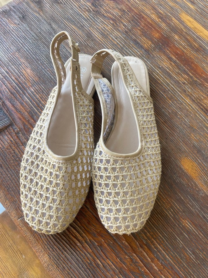 Bej renkli, örgü ve nakışlı dantel detaylı, düz topuklu bohem tarz kadın espadril, günlük kullanıma uygundur.