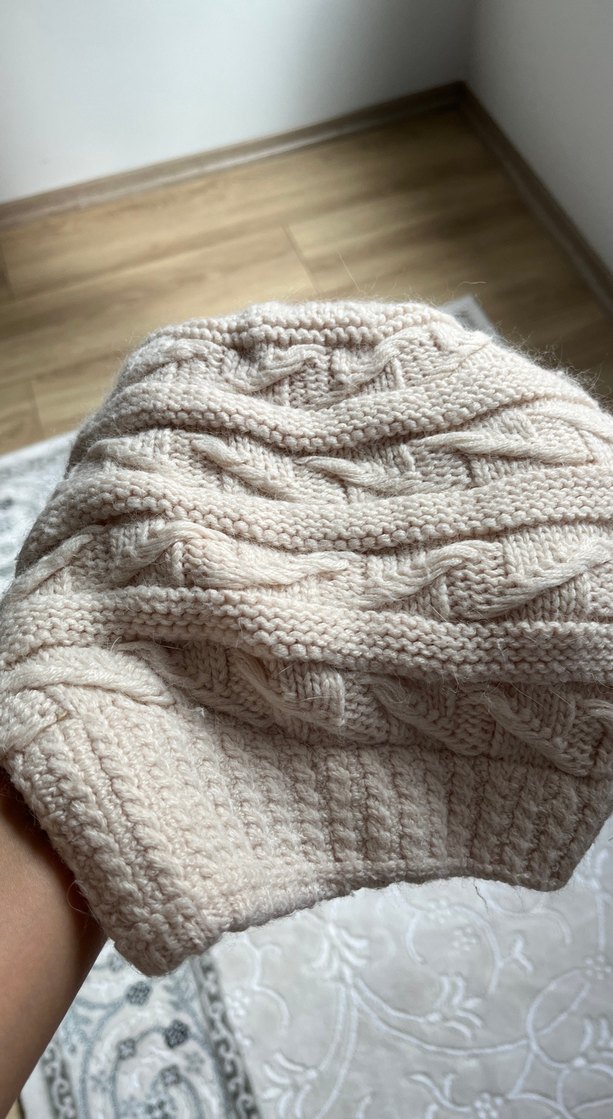 Bohem tarzda, bej renkli örgü kadın bere. Sıcak tutan yumuşak örgü kumaştan yapılmıştır, retro ve hippie tarzlara uygundur.