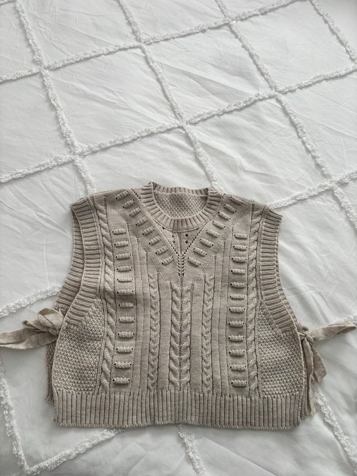 Bej renkli, örgü kumaştan, kolsuz ve yuvarlak yaka süveter. Bohem tarzı ve rahat kesimiyle günlük kullanıma uygundur.