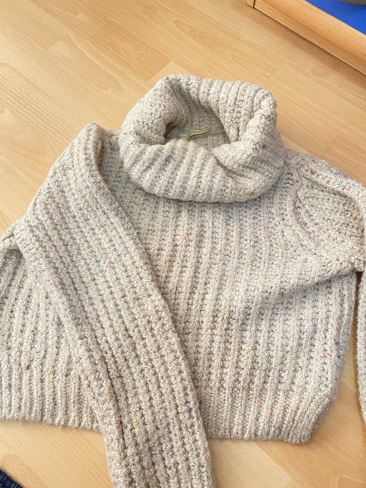 Bohem tarzda, bej renkli, örgü dokulu, boğazlı ve uzun kollu, günlük kullanıma uygun fitted kazak. Yumuşak ve sıcak tutan kumaşa sahiptir.