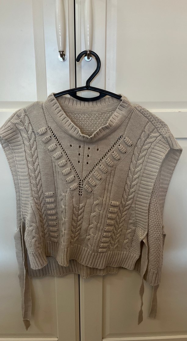 Bej renkte, örgü kumaştan, bohem tarzda, yuvarlak yakalı ve salaş kesim kadın süveter. Günlük kullanıma uygun, desensiz ve kolsuz.