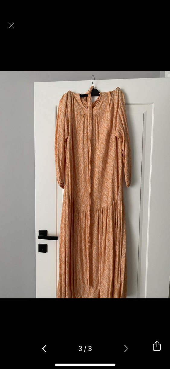 Bej renkte, bol kesim ve drapeli uzun keten elbise. Pastel tonlarda batik desenli, uzun kollu ve kayık yaka detaylı bohem tarz. Üzel dikimdır