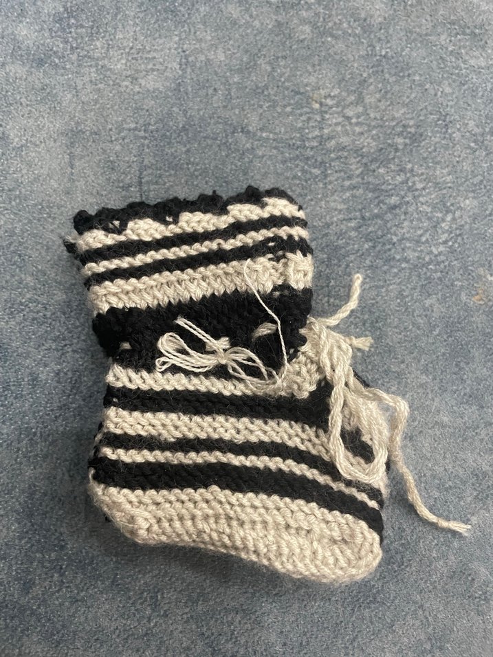 Beyaz ve gri zebralı desenli, bohem tarzda erkek bebek patik. Yumuşak örme kumaştan, rahat ve sıcak tutar. El emeği göz nuru bebek patiği hiç kullanılmamıştır