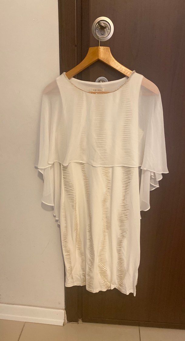 Beyaz hamile midi tunik, drapeli, kısa kollu ve tekne yakalıdır. Bol kesim, yumuşak sentetik kumaştan, hafif batik desenlidir, düğünler için uygundur. Bir kere kullanildi