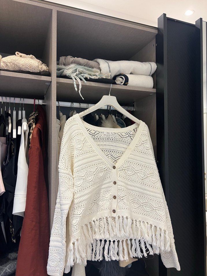 Beyaz renkli, nakışlı desenli, V yaka, uzun kollu, bol kesim midi uzunluğunda örgü hırka. Etek kısmında püskül detayları bulunur, bohem tarzda günlük kullanım için uygundur.