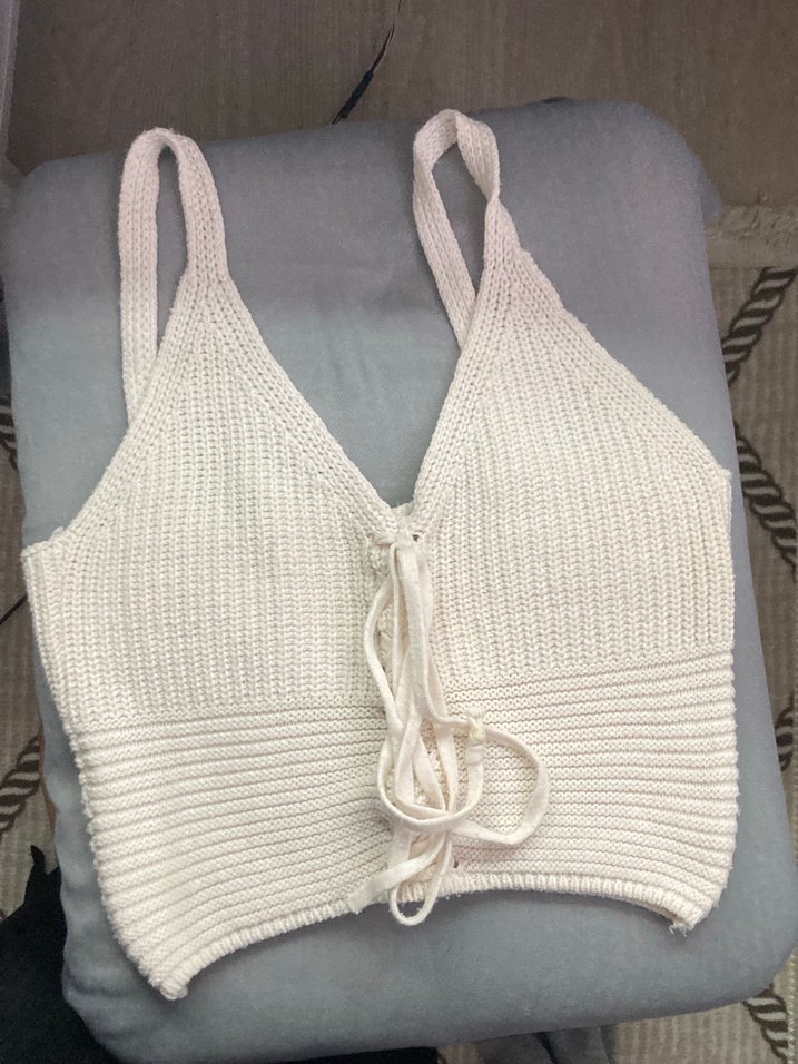 Beyaz bohem tarz örgü bralet, ince askılar ve ön bağcık detayıyla rahat ve doğal bir görünüm sunar.