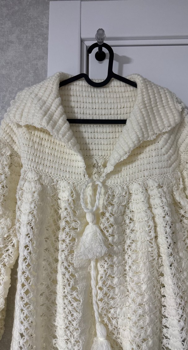 Bohem tarzda, beyaz, uzun kollu, gevşek kesim örgü hamile hırka. Rahat ve günlük kullanım için uygun, örgü dokulu bir model. İki koltuk arası 50 cm, uzunluğu 62 cm