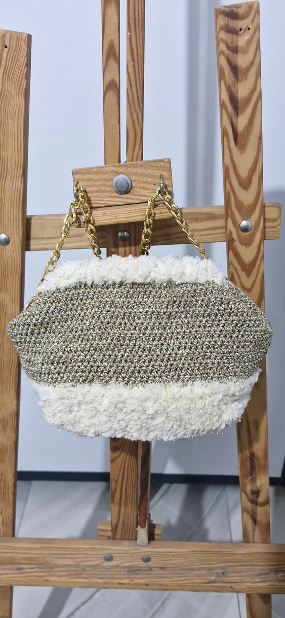 Gri ve beyaz renklerde, örgü dokulu, altın zincir saplı kadın çantası. Rahat ve bohem tarz için uygundur.