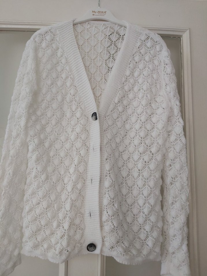 Bu beyaz örgü kadın hırka, bol kesim, uzun kollu ve V yakalıdır. Bohem tarzı ve midi uzunluğu günlük kullanıma uygun rahatlık sağlar.