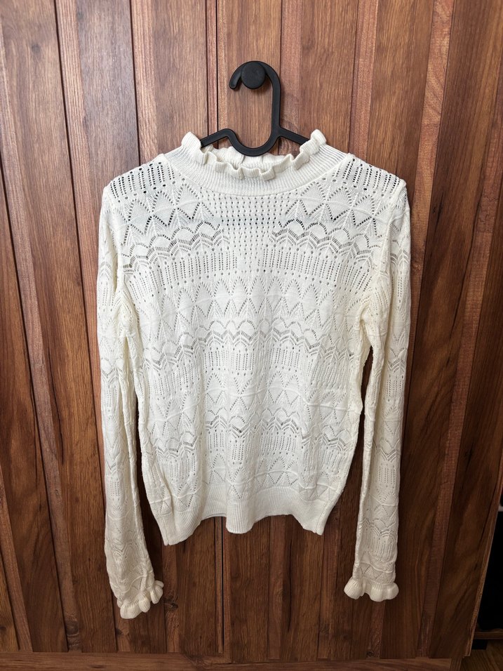 Beyaz renkli, uzun kollu ve yuvarlak yaka örgü kazak. Bohem tarzı, rahat kesimi ve ince örgü deseni ile günlük kullanıma uygun.