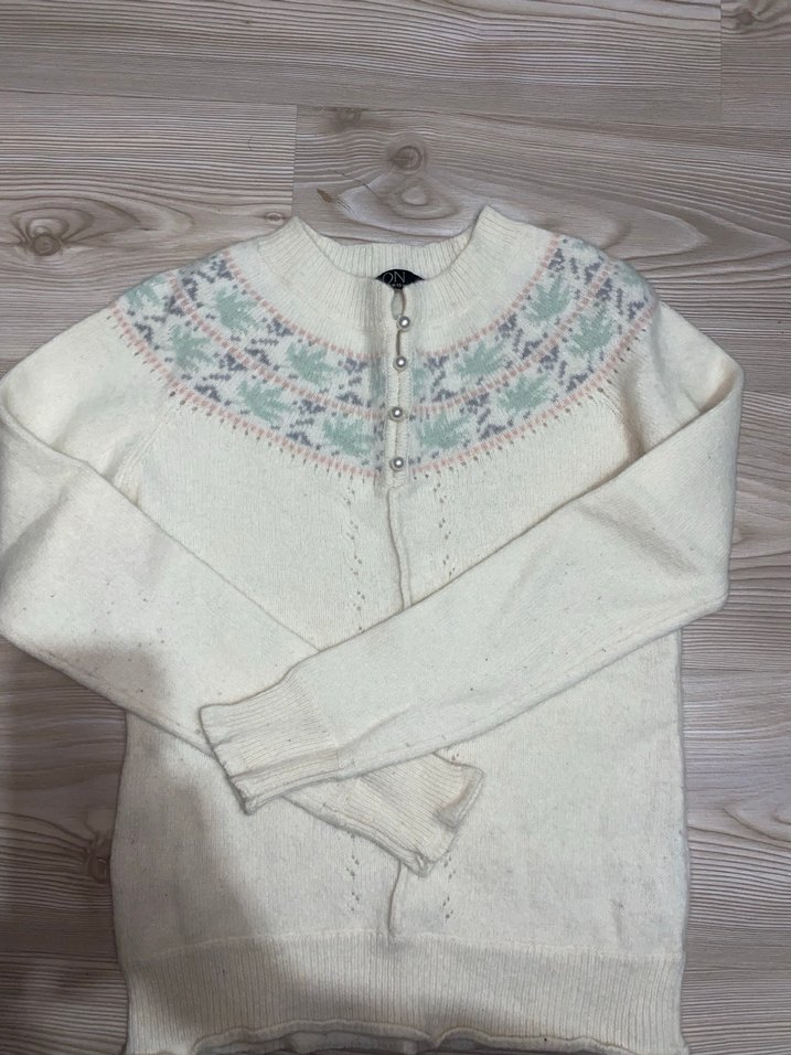 Bu beyaz yün kadın kazak, uzun kollu ve yuvarlak yaka tasarıma sahip. Gevşek kesimi ve pastel detaylarıyla bohem tarz için uygun.