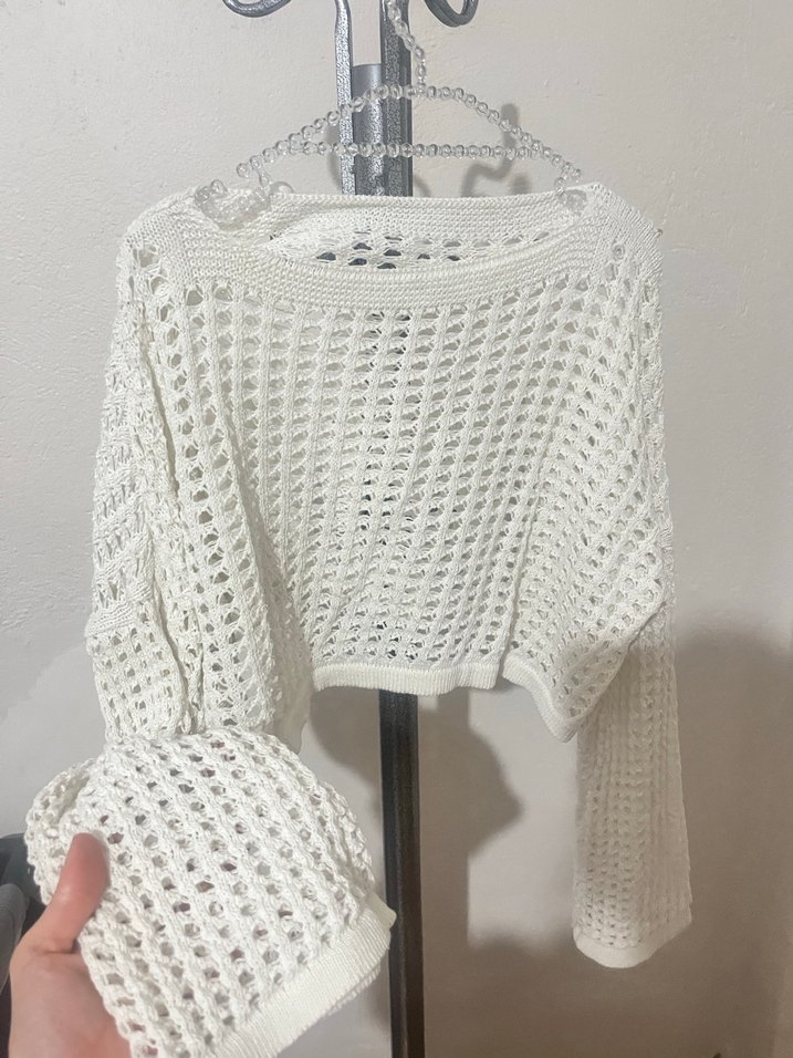 Beyaz, örgü kumaştan, bohem tarzda, uzun kollu, salaş kesim ve bisiklet yaka kadın kazağıdır. Rahat ve hafif yapısıyla günlük kullanım için uygundur.