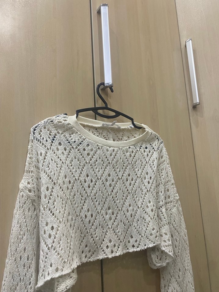 Beyaz renkli, bohem tarzı, uzun kollu, yuvarlak yakalı, rahat kesim örme kadın kazak. Günlük kullanıma uygun, açık örgü dokusu bulunur.