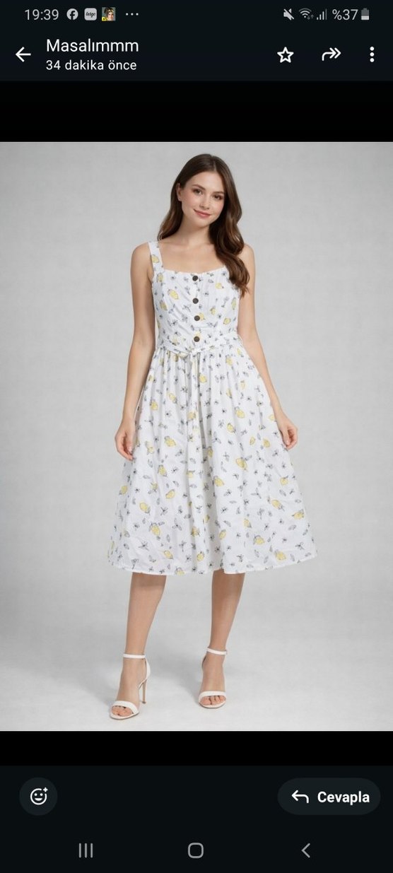Beyaz, uzun, askısız, düğmeli ve baskılı desenli bol kesim bohem tarzda elbise. Belinde kuşak bulunmaktadır.