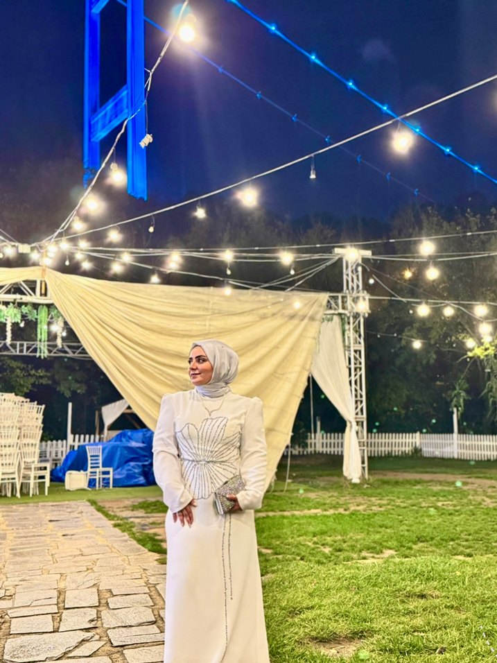 Yüksek yakalı, uzun kollu beyaz nişan elbisesi, etnik desenli drapeli detaylarla. Bohem tarzda, sade ve rahat kesim, düğünler için uygun.