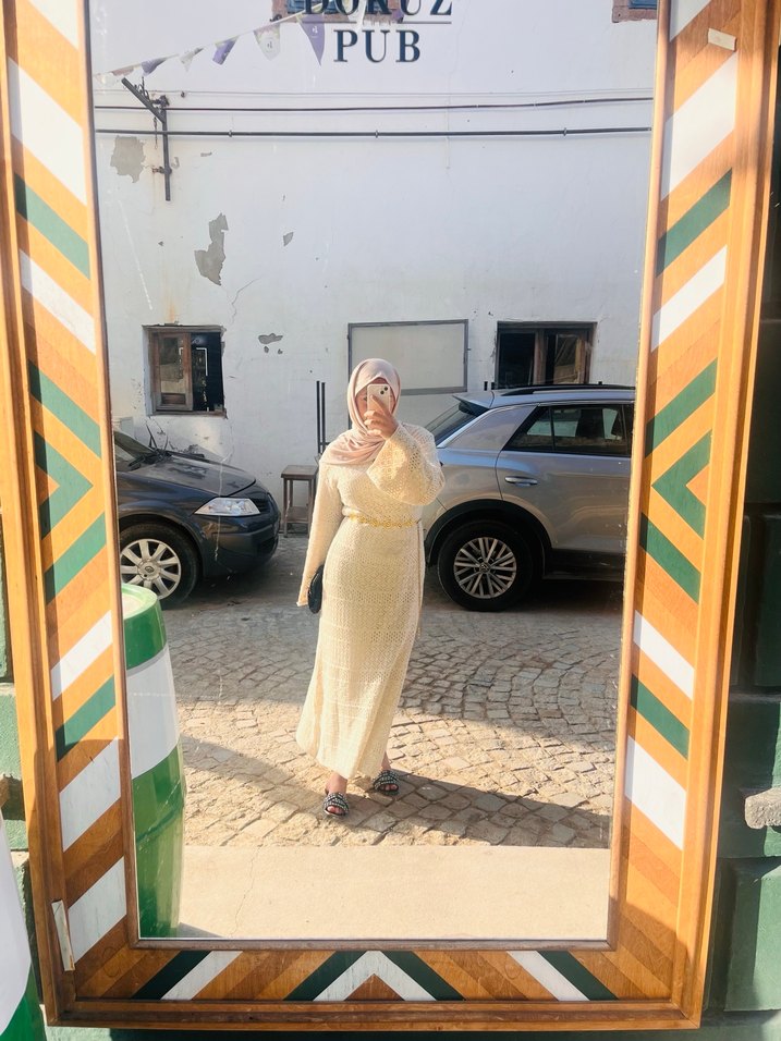 Bu beyaz triko elbise, bol kesim ve drapeli detaylara sahip, uzun kollu ve boğazlıdır. Etnik desenlidir ve mütevazı tarza uygundur. Günlük kullanım için uygundur.