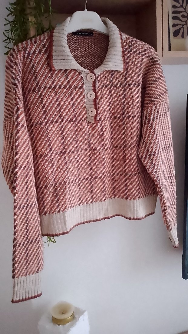 Kadınlar için boğazlı yaka ve düğme detaylı, kahverengi ve gri desenli, rahat kesim uzun kollu örme kazak. Rahat ve bohem tarzda günlük kullanım için uygundur.