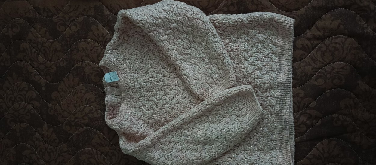 pembe renkli, boğazlı ve uzun kollu, triko örgüden yapılmış, bol kesim rahat bohem tarz kazak.