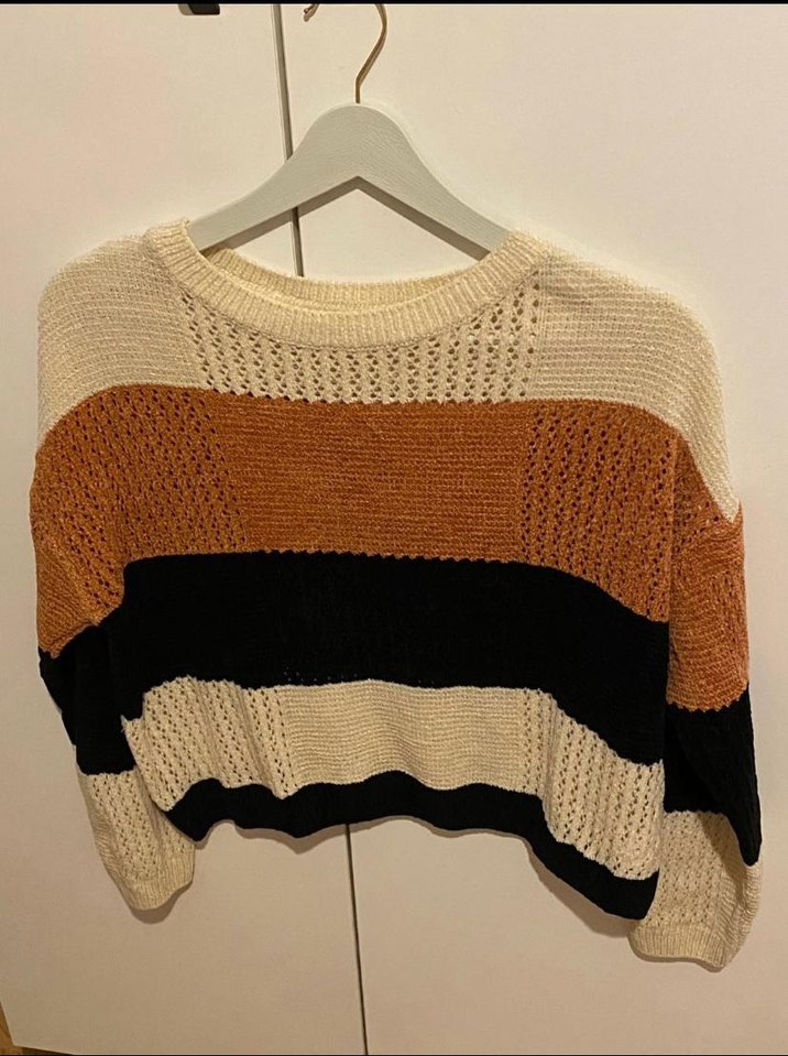 Bohem tarzda, çizgili örgü kadın kazak. Uzun kollu, yuvarlak yakalı ve rahat kesim, günlük kullanıma uygun.