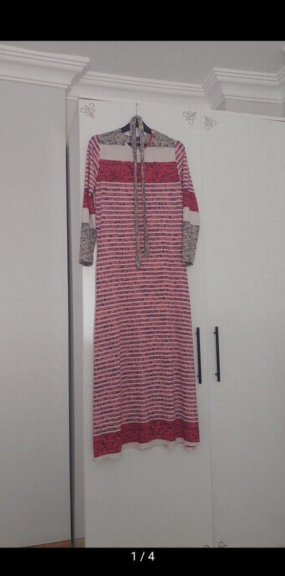 Uzun kollu, bol kesim elbise, tekne yakalı ve çizgili batik desenli, örme dokulu, gri ve çok renkli.SIFIR ürün