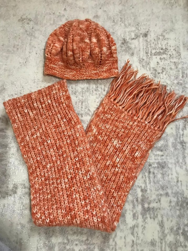 Bohem tarzda el yapımı örgü atkı, yumuşak karışık turuncu örgüden yapılmış çocuk bere ve püsküllü atkı seti.
