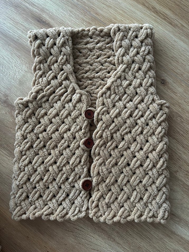 Bohem tarzda, boğazlı ve düğmeli, bej tonlu örgü çocuk yeleği. Kolsuz ve vücuda oturan kesime sahip.
