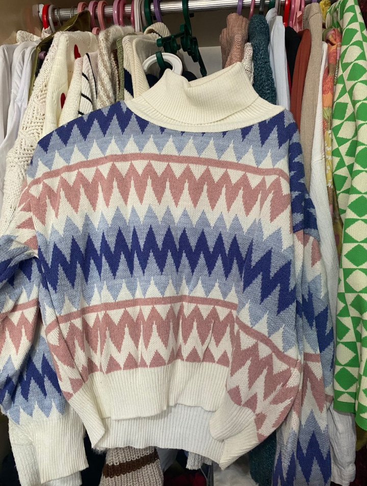 Kadınlar için balıkçı yaka, uzun kollu, örme kumaştan yapılmış bol kesim kazak. Çok renkli pastel geometrik desenlere sahiptir sorunsuzdur