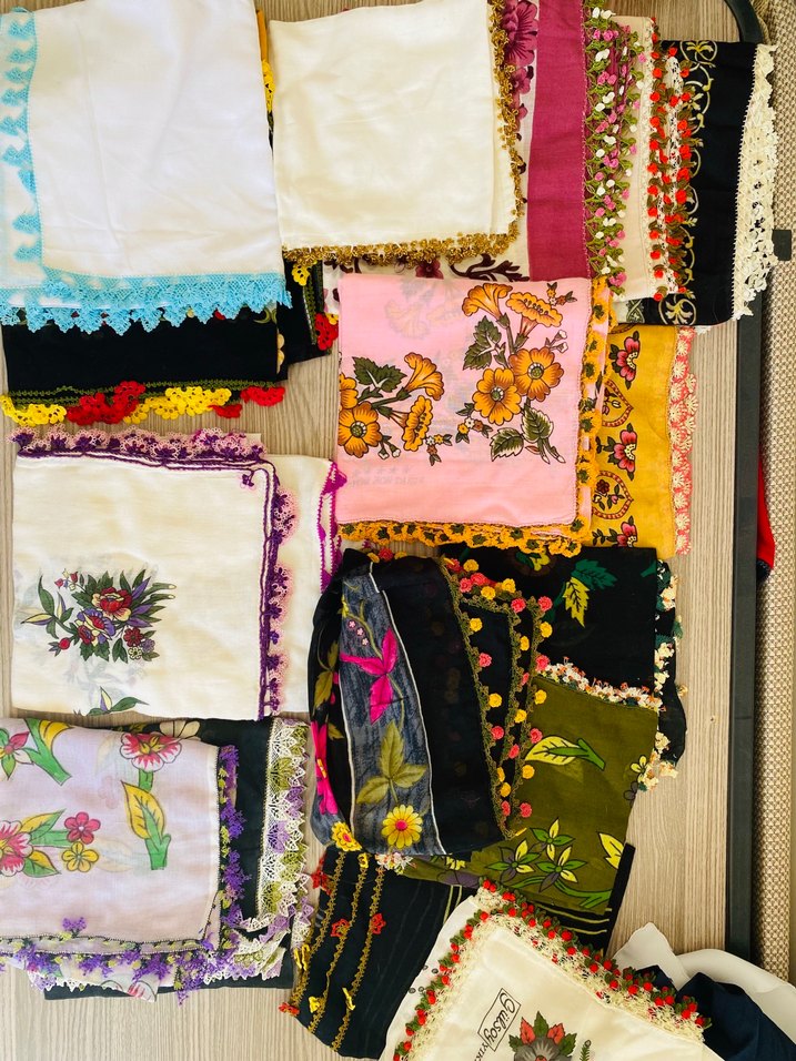 Bohem tarz çok renkli tekstil kumaşlı, dantel detaylı kadın başörtüsü . Canlı ve koyu tonlarda, retro hippie görünümüne uygun.
