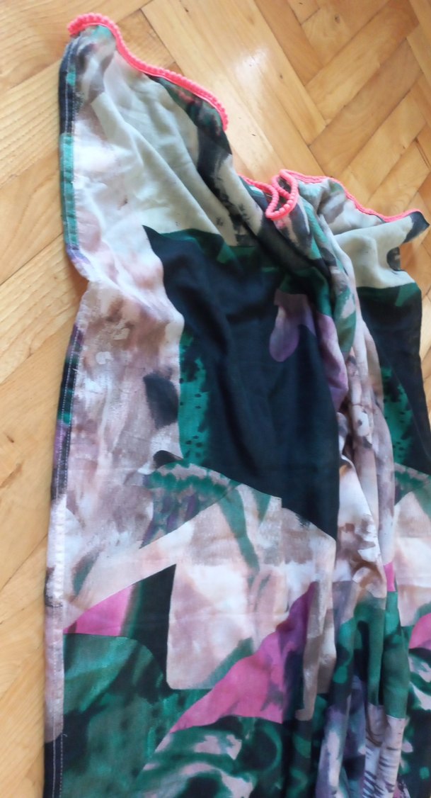Kadınlar için çok renkli, pastel tonlarda tekstil kumaştan yapılmış, bohem tarzda drapeli şal. Trend belirleyiciler için uygun.