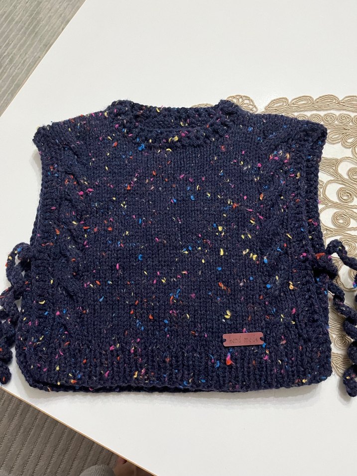 Karanlık çok renkli örgü kumaştan, bohem ve retro tarzda, yuvarlak yakalı, kolsuz, bol kesim kız yeleği.