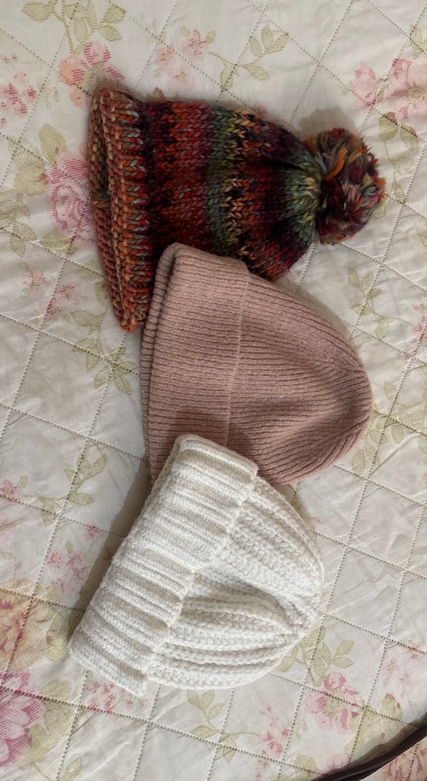 Bu set, çok renkli ponponlu, yumuşak pembe ve beyaz fitilli örgü olmak üzere üç kadın bere içerir. Rahat ve bohem tarz için ideal.