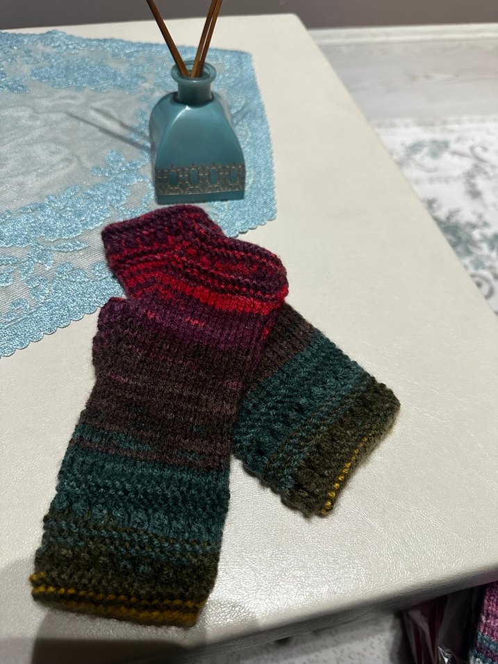 Kadınlar için çok renkli, koyu tonlarda örgü eldivenler. Bohem tarzı ve rahat bir görünüm sunar.