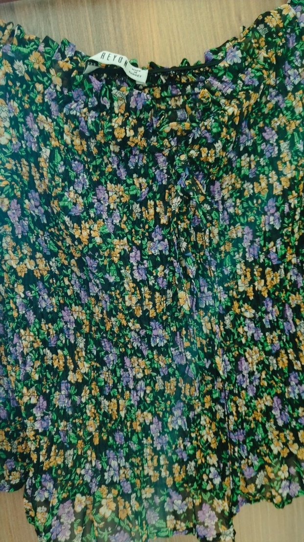 Bohem tarzda, koyu çok renkli çiçek desenli, fırfırlı uzun bluz. Salaş kesim, V yaka ve askılı kollar outdoor kullanım için uygundur. s,m uyumludur