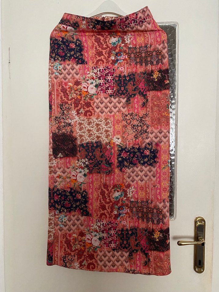 Drapeli, bol kesim, çok renkli koyu desenli uzun etek. Evde rahat bohem tarz için uygundur.Kapalı yırtmaçlıdır.38-40 beden için uygundur